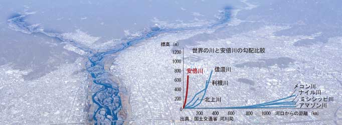 3000m級の山々が連なる南アルプスの広大な山間地域から、日本一深く急峻な水深2500mの駿河湾まで、その間わずか50q、高低差2000mを一気に駆け下る安倍川。暴れ川として恐れられた川は、幾多の災害をもたらしてきた一方で、数多の恵みを与えてきた川でもある。