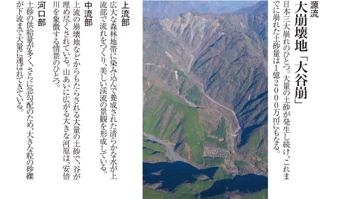 脆弱な地質構造を持つ大崩壊地「大谷崩」に源を発し、大量の土砂を流すことで、平野部の扇状地を形成した。安倍川下流の登呂遺跡は、弥生時代後期の稲作文化を今に伝え、以降、安倍川を中心にこの地は発展を遂げてきた。徳川家康が、山・川・海の幸が豊富に手に入るとして、この地に大いなる可能性を見いだしたように、現在も安倍川一帯は豊かな自然の資源に満たされている。広大な森林地域で作り出された清らかな水は、豊かな農作物を育み、砂礫層(されきそう)に蓄えられた伏流水は地下水や湧き水として絶えず美しい水を供給し続けている。また森林の栄養分は安倍川によって海に流れ、その養分を求めて海の生き物たちがここに集まるのだ。
